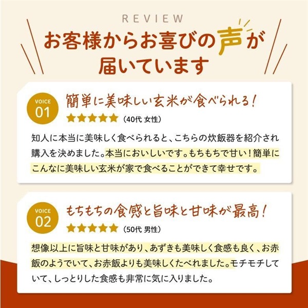高圧力で玄米を炊き上げることで、芯までしっかり熱が入り、 ふっくらとした食感に仕上げます。 玄米は硬くて食べにくいというイメージを変える炊き上がりです。